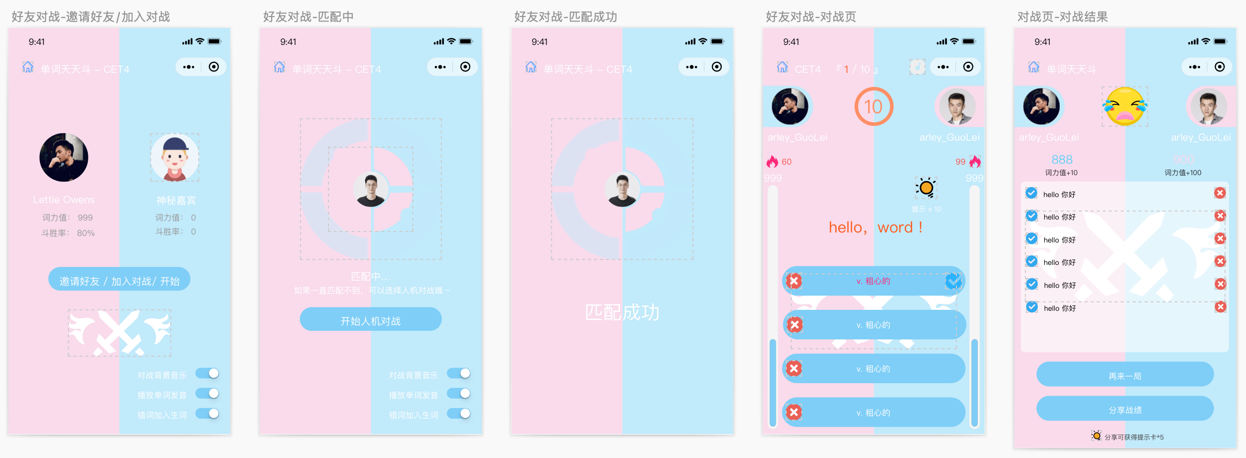 对战结束:每局对战结束后,需要显示该局的对战结果,包含:本局所有词汇选择结果、用户的选择得分、对战输赢情况。对战结束后根据本局分数计算增加相应的词力值,对战结束页可选择「分享战绩」、「再来一局」。
