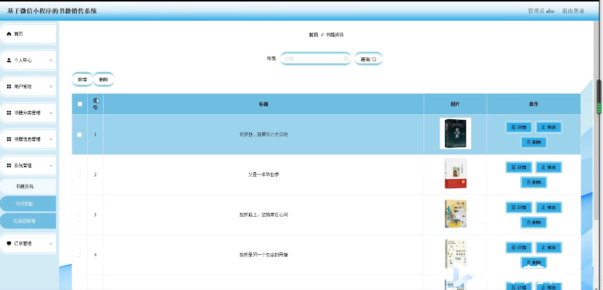 系统管理,在书籍资讯页面可以对索引,标题,图片等内容进行详情,修改和删除等操作,还可以对在线客服,轮播图管理等内容进行详细管理;如图5-11所示。