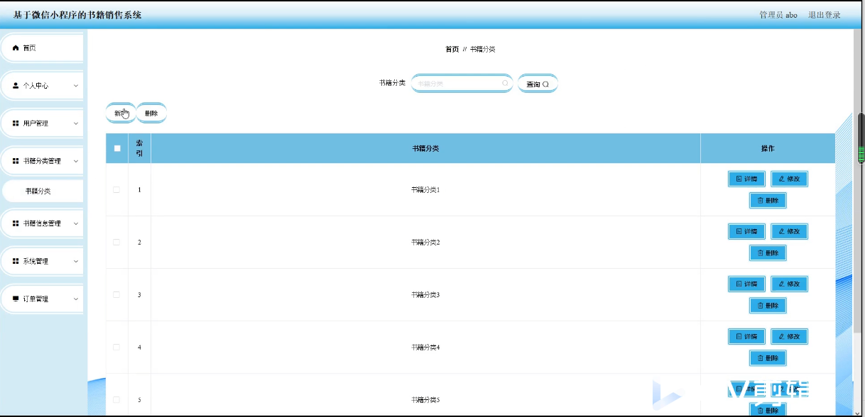 书籍分类管理,在书籍分类页面可以对索引,书籍分类等内容进行详情,修改或删除等操作,如图5-9所示。