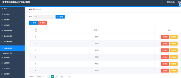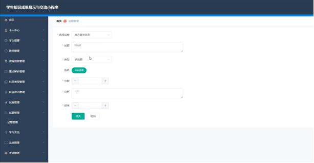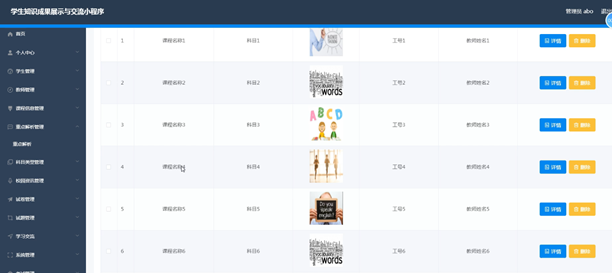 学生知识成果展示与交流管理员功能有个人中心,学生管理,教师管理,课程信息管理,重点解析管理,科目类型管理,校园资讯管理,试卷管理,试题管理,学习交流,系统管理,考试管理等。