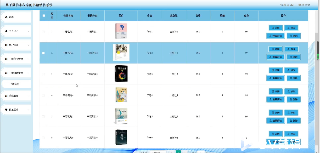 书籍信息管理,在书籍信息页面可以对索引,书籍名称,书籍分类,图片,作者,出版社,价格,单限,库存等内容进行详情,查看评论,修改和删除等操作,如图5-10所示。