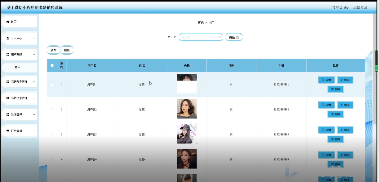 用户管理,在用户页面可以对索引,用户名,姓名,头像,性别,手机等内容进行详情、修改或删除等操作,如图5-8所示。