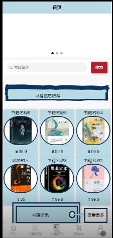 该款书籍销售系统;用户可以通过注册账号从而登入系统主界面来实现相对应的功能,分别是查看首页,书籍信息,书籍资讯,购物车,我的等功能。