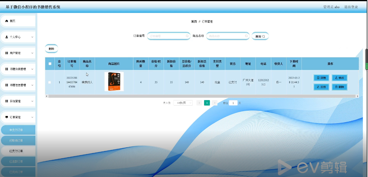 订单管理,在已支付订单页面可以对索引,订单编号,商品名称,商品图片,购买数量,价格/积分,折扣价格,总价格/总积分,折扣总价格,支付类型,状态,地址,电话,收货人,下单时间等内容进行详情,修改,发货和删除等操作,还可对已完成订单、已发货订单、未支付订单、已取消订单、已退款订单进行相对应操作,如图5-12所示。