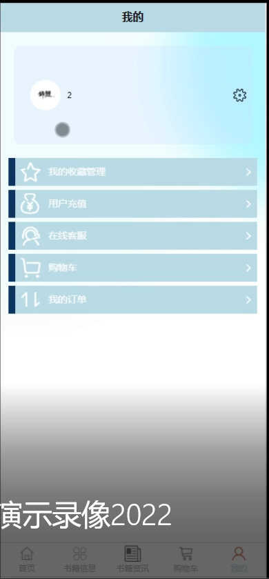 用户登陆系统后,可以对首页,书籍信息,书籍资讯,购物车,我的等功能进行详细操作,如图5-2所示。