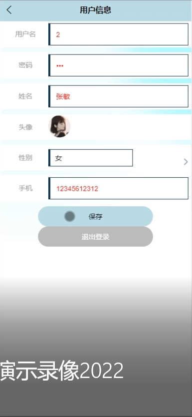 用户信息,在用户信息页面可以查看用户名,密码,姓名,头像,性别,手机等信息,并进行保存和退出登陆操作;如图5-5所示。